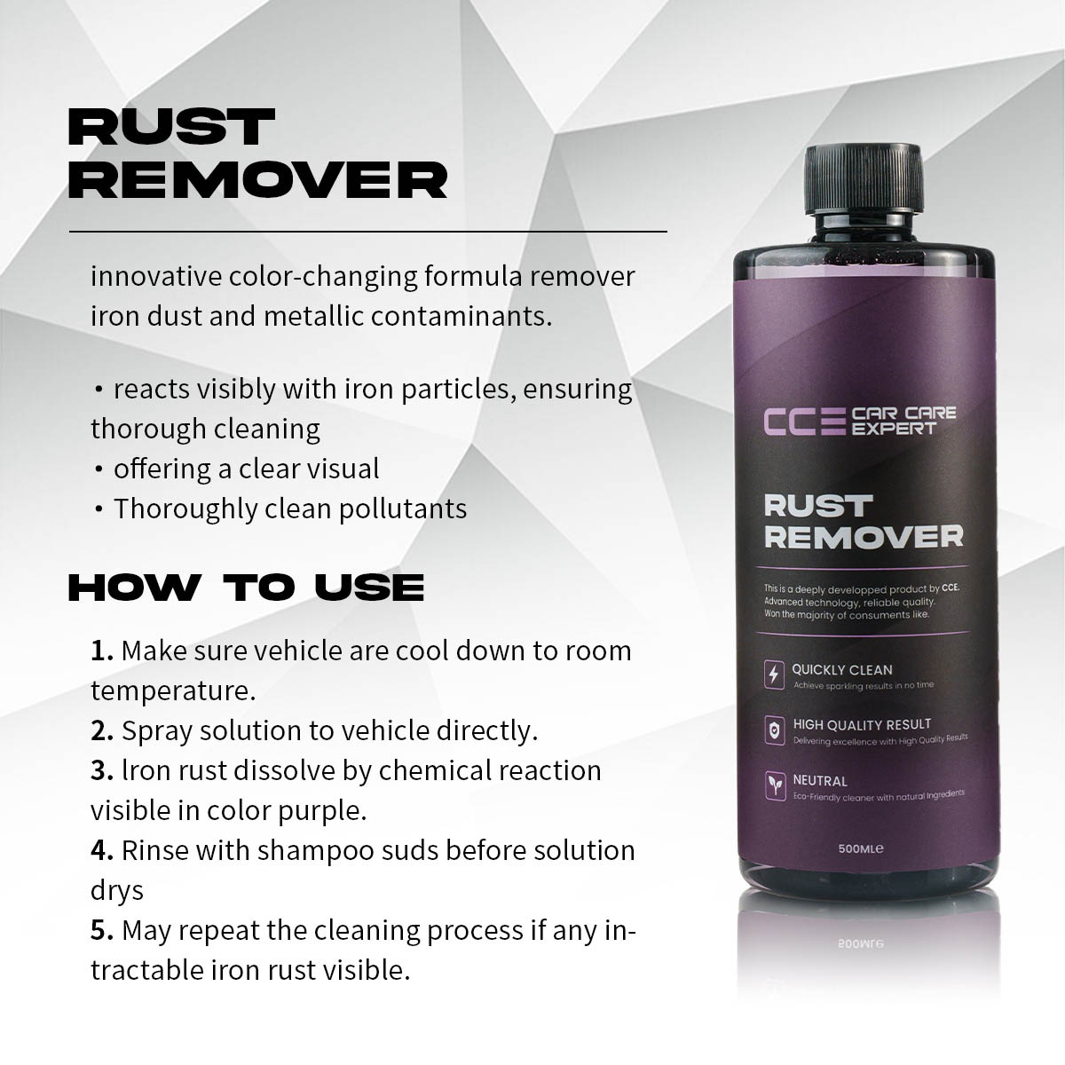 Deze innovatieve roestverwijderaar met kleurverandering richt zich op en lost ijzerdeeltjes en metaalverontreinigingen op. Ideaal voor velgen en lakwerk, met een zichtbare reactie die grondige decontaminatie aantoont.